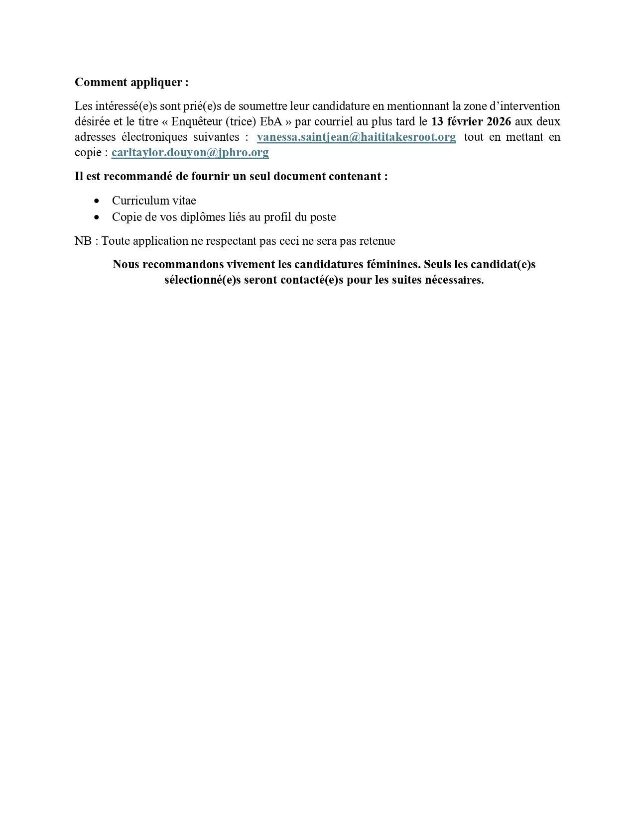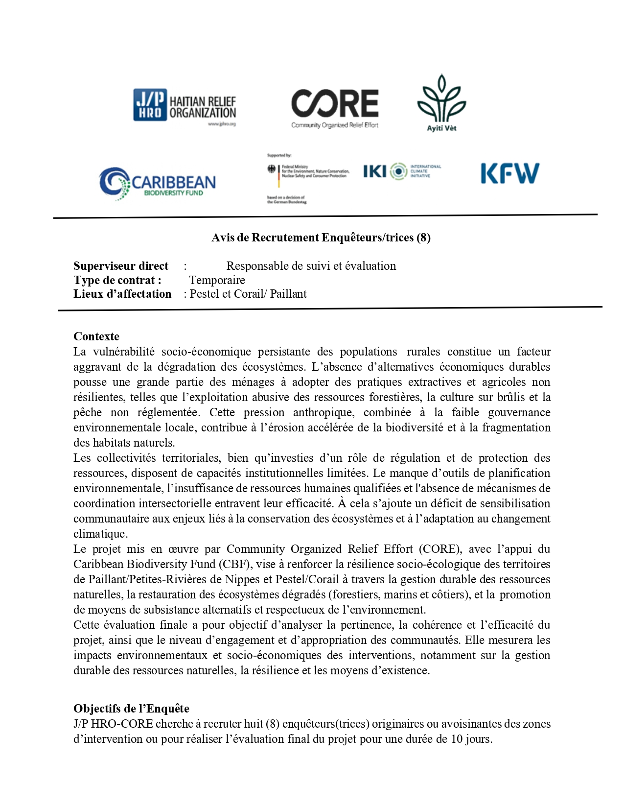 NB : La plateforme EPS Caraïbes ne fait que relayer les offres d'emploi de l'institution et elle n'a aucune implication dans le traitement et la sélection des dossiers du(es) Candidat(es) ! Merci de suivre les instructions et d'acheminer directement vos candidatures auprès de l'institution qui recrute pour ce poste, en suivant les informations données dans la partie descriptive du présent poste !