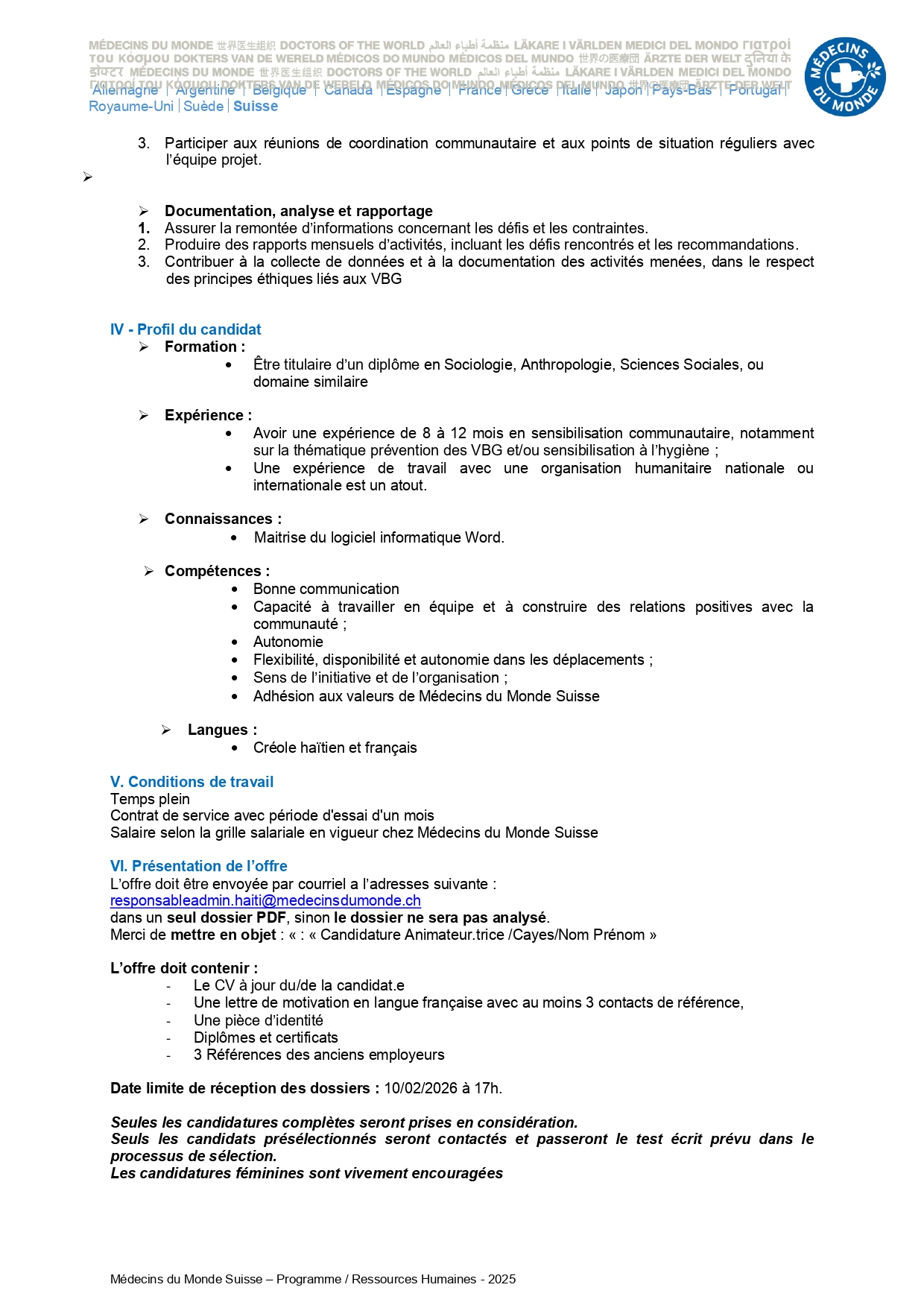 Avoir une expérience de 8 à 12 mois en sensibilisation communautaire, notamment sur la thématique prévention des VBG et/ou sensibilisation à l’hygiène.