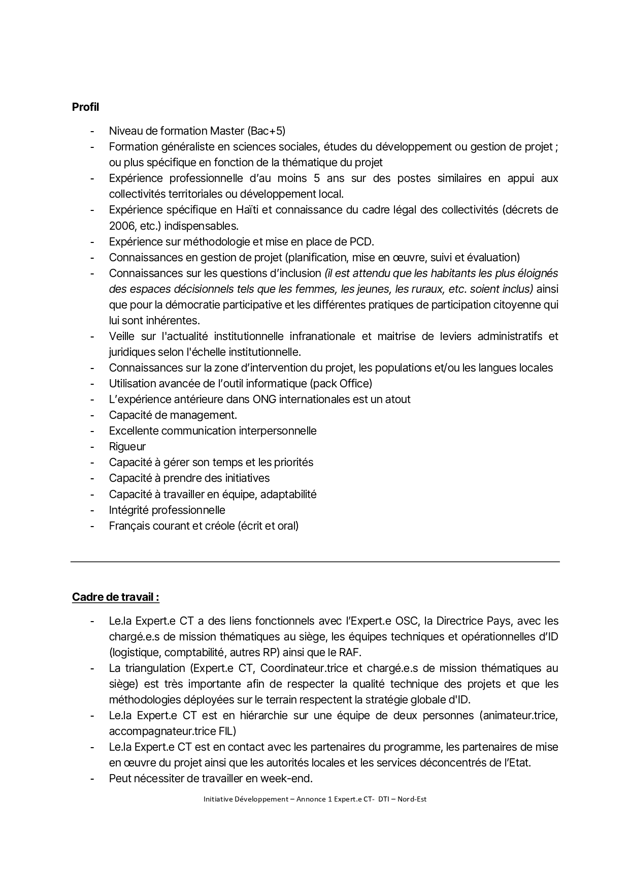 - Expérience spécifique en Haïti et connaissance du cadre légal des collectivités (décrets de 2006, etc.) indispensables.