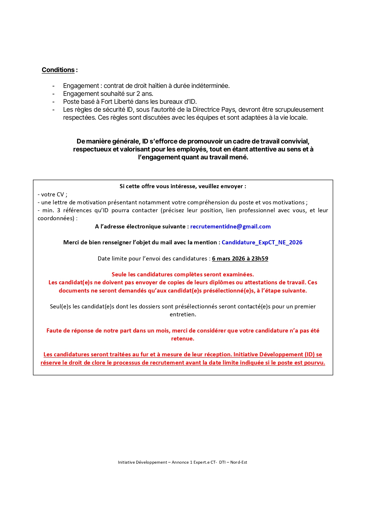 Ce poste s’inscrit dans le cadre de la Composante 1 du programme DTI, une initiative majeure financée par l'Union Européenne pour renforcer la résilience du Nord-Est d’Haïti face aux crises multidimensionnelles.